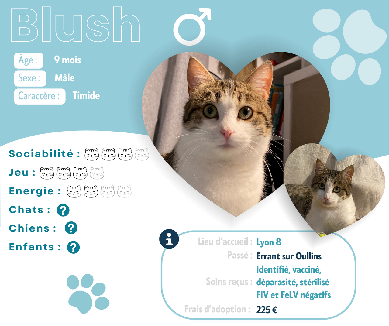 Je suis un chat qui a besoin de patience, je suis assez craintif au premier abord mais avec du temps, je me montre joueur et affectueux. On dit de moi que je suis très beau et je ne m’en cache pas.