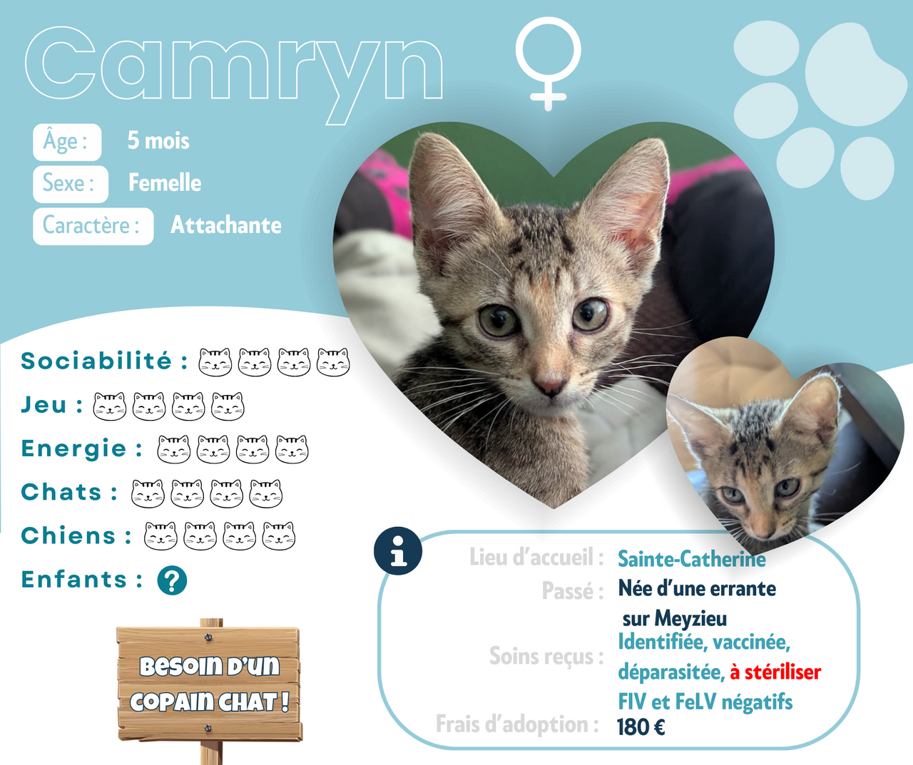 Salut ! Moi c'est Sam. Je suis née aux alentours du 08/05/2025. Je suis la sœur de Clover et de Alex. Je suis la plus courageuse de la fratrie ! J’adore explorer, je suis super curieuse et surtout j’adore les câlins ! Je suis sortie récemment de la rue alors il y a...