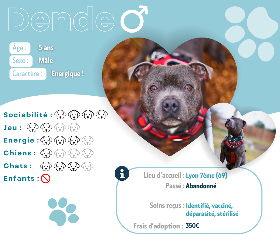 Je suis un Staffie de 5 ans, je fais partie de ces chiens qu’on remarque vite : parce que j’accueille le monde en faisant la fête, parce que je colle aux humains comme si ma place était toujours juste à côté d’eux, parce que je vis tout intensément.