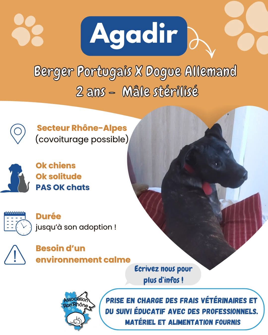 Agadir, c’est un grand chien de 2 ans, croisé Berger Portugais x Dogue Allemand, avec un cœur énorme mais une vie déjà un peu bousculée.