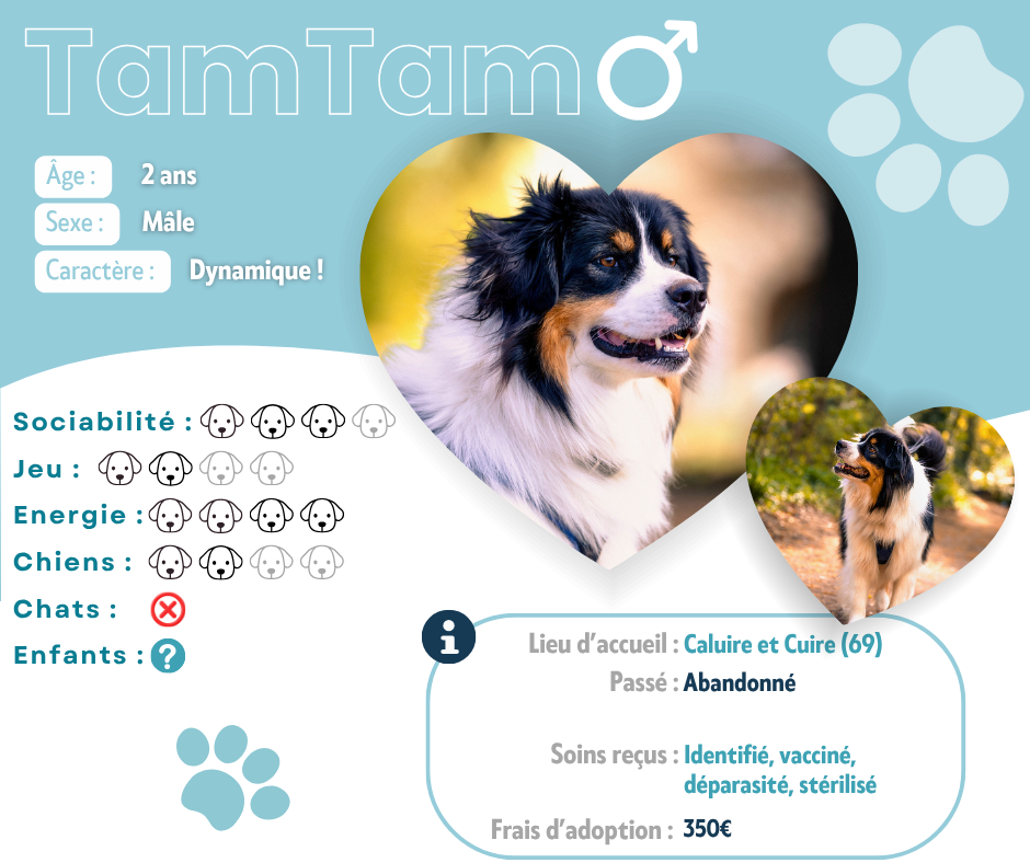Moi, c’est Tam-Tam ! Je suis un compagnon fusionnel, loyal et très expressif. Si tu cherches un chien discret qui se fait oublier, je ne suis pas ton homme. En revanche, si tu veux un partenaire de vie avec qui partager de grandes aventures, on est fait pour s’entendre !                       Je suis un adepte des rituels et de la routine. J’ai besoin d’un cadre stable et prévisible pour être serein. Je suis ce qu’on appelle un chien ‘pot de colle’ : quand j’ai besoin d’attention ou que je veux quelque chose, je sais me faire comprendre en restant très proche de toi. La nuit, je dors paisiblement à tes pieds une fois que je suis passé en mode dodo. Attention : si mon rythme change (balade trop tardive, horaires décalés), je monte vite en pression et je l’exprime par des aboiements de protestation.